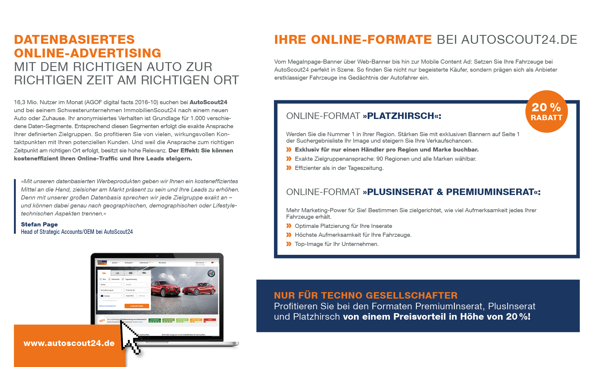 AutoScout24 ist europaweit das größte online Automobil-Anzeigenportal. Der Marktplatz ermöglicht es seinen Kunden sich den Traum vom eigenen Auto einfach, effizient und stressfrei zu erfüllen. Auf AutoScout24 können Händler und Privatverkäufer Anzeigen für Gebraucht- und Neuwagen schalten. In Deutschland genießt AutoScout24 in seiner Zielgruppe eine einzigartige gestützte Markenbekanntheit von 95 Prozent. Gemeinsam mit Scout24 Media, dem digitalen Werbevermarkter der Scout24-Gruppe, hat AutoScout24 daher zielgruppengenaue Werbeformen entwickelt. So präsentieren Sie Ihre Fahrzeuge genau den Suchenden, zu denen sie optimal passen.