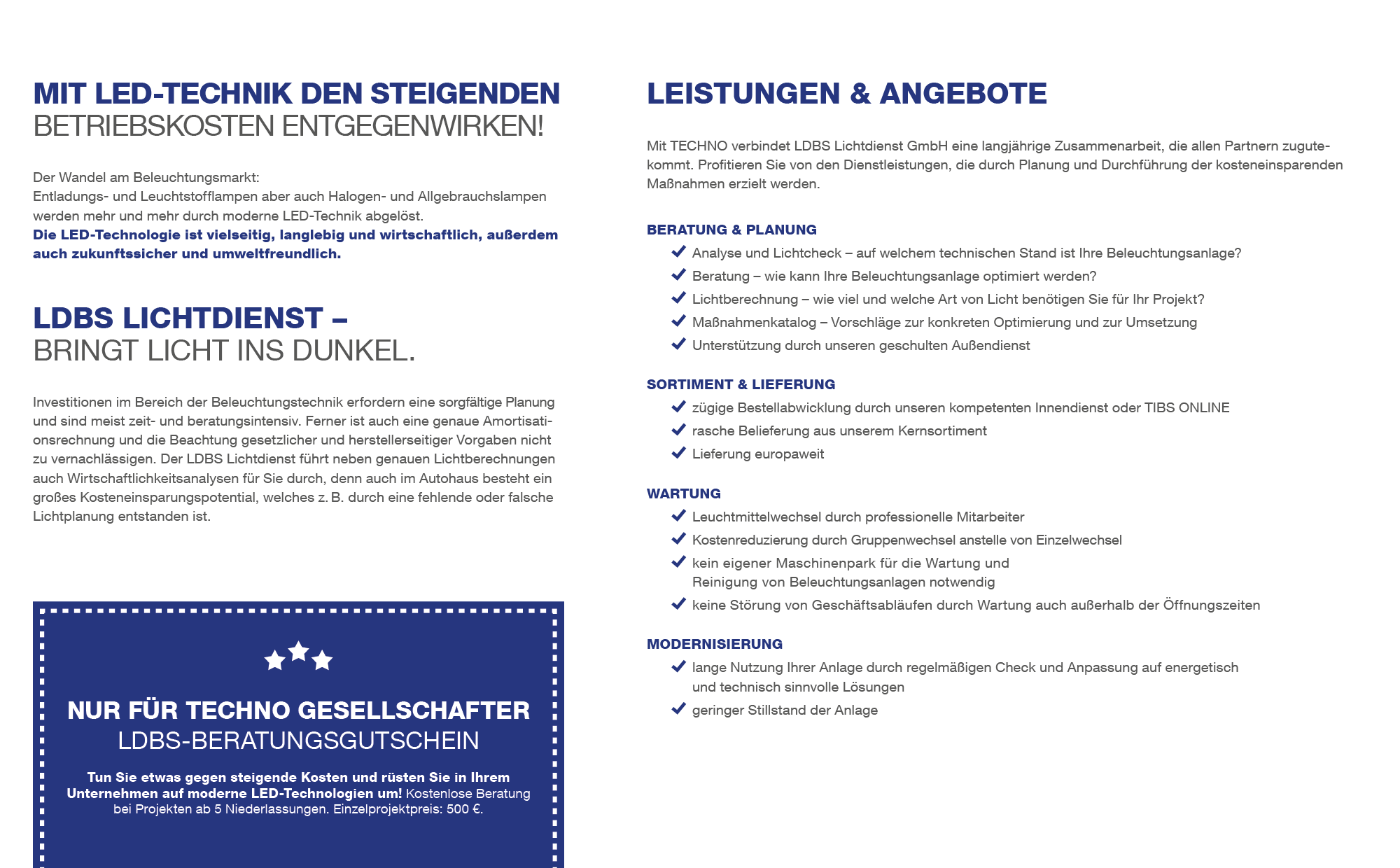 LDBS Lichtdienst ist ein Full-Service-Unternehmen, welches umfassende Dienste von der Beratung & Planung bis hin zur Umsetzung Ihrer Licht-Visionen abdeckt und Ihnen mit mehr als 4.000 Marken-Artikeln ein großes Sortiment an Produkten anbietet. Auch in Fragen der Wartung und Modernisierung steht LDBS Ihnen als Partner mit langjähriger Erfahrung und Fachwissen zur Seite.