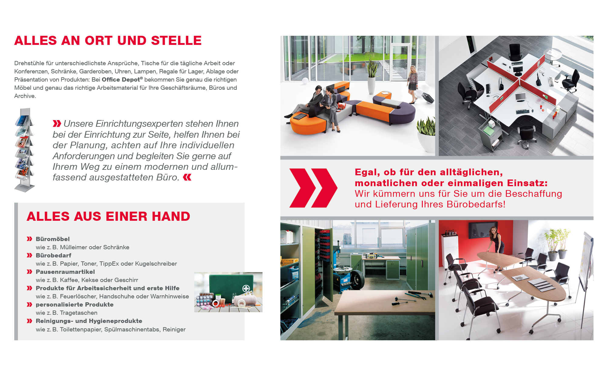 Allein in Europa ist Office Depot in dreizehn Ländern vertreten und bietet einem großen gewachsenen Kundenstamm Arbeitsplatzbedarf in Form von Bürotechnik, Technologieprodukten, Büromaschinen, Druckzubehör, Anlagenausstattung und Möbeln an. Mit mehr als 25 Jahren Erfahrung tritt Office Depot dabei als vertrauenswürdiger und zuverlässiger Partner auf, der sich zusammen mit seinen Kunden für erhöhte Produktivität, verbesserte Prozesseffizienz, niedrigere Kosten und gestärkte Nachhaltigkeit einsetzt.